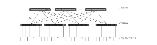 34 leaf 12 spine at 1.8:1 over-subscription ratio for a total of 1496 device 10Gbps/1Gbps ports