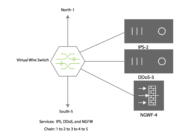 The Inline Service feature manages service chains for Layer 1 VirtualWire switches. The term, Inline Services, refers to services attached to a Layer 1 VirtualWire switch such as Next-Generation Firewall (NGFW), Intrusion Detection System (IDS), Intrusion Prevention System (IPS), and Distributed Denial of Service attack (DDoS) Prevention.