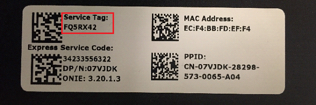 You can also find the service tag from the label of the packaging material as well. The service tag is also located on the device. See the examples (from the packaging label and the top cover of the device) in the figures below: